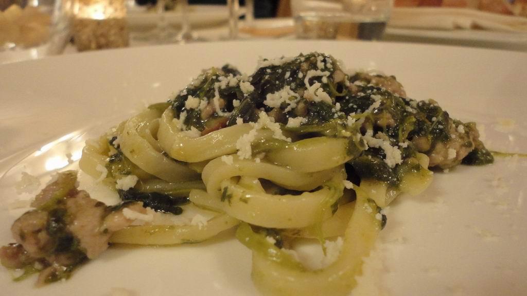 Qui si percepisce un bel gioco di contrapposizioni : l’estrema “dolcezza” della pasta fatta a mano viene stemperata dall’amarognolo dei broccoli e dalla sapidità della salsiccia, esalta il tutto l’aromaticità dei porcini aiutata dal sapore forte della ricotta di pecora salata.