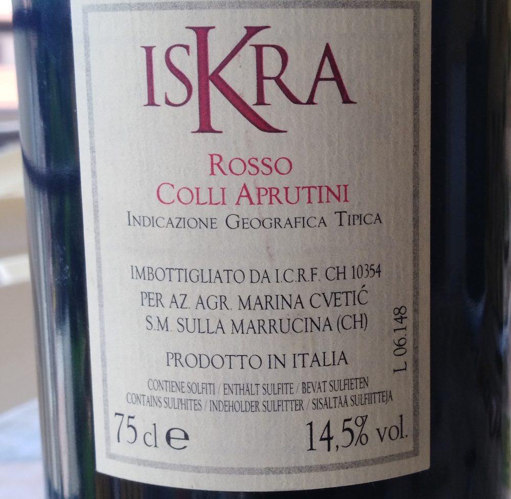 Da un po’ di tempo a questa parte sto scendendo sempre più spesso in cantina alla scoperta di bottiglie datate e soprattutto inedite, che avevo quasi dimenticato a distanza di anni. Bene anche questa volta penso che sia stato fortunato a scovare una bottiglia come la volevo io. Si tratta dell’etichetta Iskra Rosso Colli Aprutini Igt 2004 dell’Azienda Agricola Marina Cvetic di San Martino sulla Marrucina in provincia di Chieti, per accompagnare il mio pranzo domenicale.