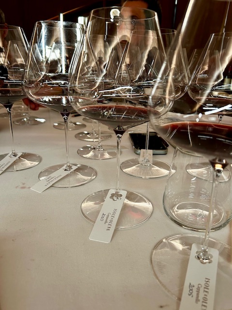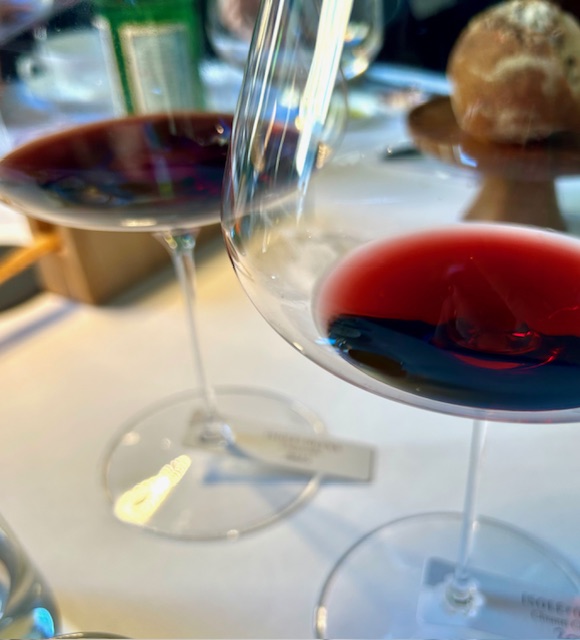 A pranzo, un assaggio di Cepparello 2022 in anteprima, da un’annata calda e secca, senza pioggia, che ha portato ad una vendemmia anticipata, con uve concentrate, la seconda ad essere affinata in botte grande: ovviamente ancora grezza, ma molto promettente, con il suo frutto pronunciato e la sua spiccata acidità, anche se è difficile dare un giudizio definitivo, adesso. Tuttavia, l’andamento climatico lascia presagire un profilo potente, con tannini marcati ed un’espressione di frutta intensa.