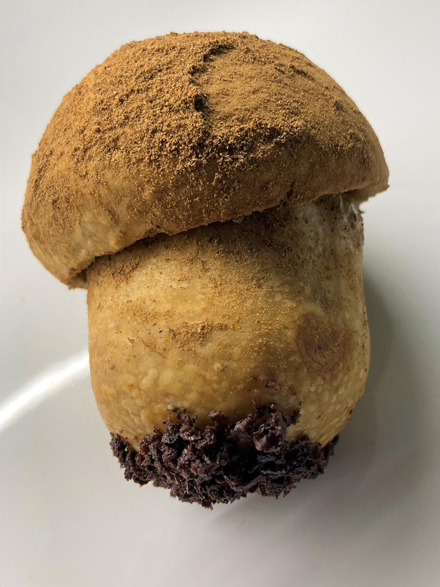 Impastare in maniera tradizionale e far lievitare in massa l’impasto ricavato, coperto con una pellicola per alimenti. Dividere quest’ultimo in pezzi da 50 g e 35 g. Far lievitare le palline da 50 g in uno stampo in silicone a forma di mezza sfera, dal diametro di 8 cm, fino a che l’impasto non abbia triplicato il suo volume iniziale. Contemporaneamente, far lievitare le palline da 35 g in un cilindro d’acciaio dal diametro di 5 cm (precedentemente oleato), fino che anche queste ultime non raggiungano il triplo del loro volume iniziale. Le palline di impasto inserite nella mezza sfera, serviranno per creare la testa del fungo, mentre quelle inserite nel cilindro, per creare il gambo. Successivamente, cuocere per 3 minuti a 130 °C a secco e per 15 minuti a vapore a 100 °C. E’ possibile abbatterli in negativo e rigenerarli per 30 secondi in microonde a 1800 W.
