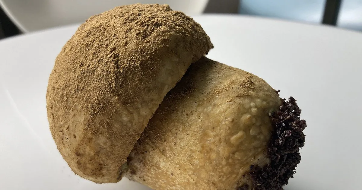Impastare in maniera tradizionale e far lievitare in massa l’impasto ricavato, coperto con una pellicola per alimenti. Dividere quest’ultimo in pezzi da 50 g e 35 g. Far lievitare le palline da 50 g in uno stampo in silicone a forma di mezza sfera, dal diametro di 8 cm, fino a che l’impasto non abbia triplicato il suo volume iniziale. Contemporaneamente, far lievitare le palline da 35 g in un cilindro d’acciaio dal diametro di 5 cm (precedentemente oleato), fino che anche queste ultime non raggiungano il triplo del loro volume iniziale. Le palline di impasto inserite nella mezza sfera, serviranno per creare la testa del fungo, mentre quelle inserite nel cilindro, per creare il gambo. Successivamente, cuocere per 3 minuti a 130 °C a secco e per 15 minuti a vapore a 100 °C. E’ possibile abbatterli in negativo e rigenerarli per 30 secondi in microonde a 1800 W.