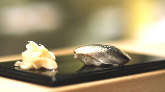 All’inizio tocca ai classici: hirame (halibut), sumi-ika (seppia), aji (lanzardo), akami (tonno magro), chu-toro (medio tonno), o-toro (ventresca), kohada (dorosoma cepedianum, aringa americana), tutti presentati in forma di nigiri.