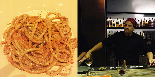Credo che l’esemplificazione migliore sia nei bucatini che ci ha cucinato Joe Mercuri. Bucatini cotti nell’acqua e poi messi in una placca d’acciaio nel grande camino a legna che campeggia in sala. Per farli affumicare, nello stile canadese. Quindi, eccoli in tavola con una grattugiata resa croccante di formaggio Asiago e da una nuance di tartufo bianco. Piatto terragno.