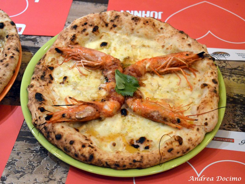 Gamberi avvolti con lardo di Colonnata, provola e champagne: la pizza forse meglio equilibrata delle tre. I gamberi erano già sgusciati e le teste erano soltanto un artificio scenico. Gradevole.