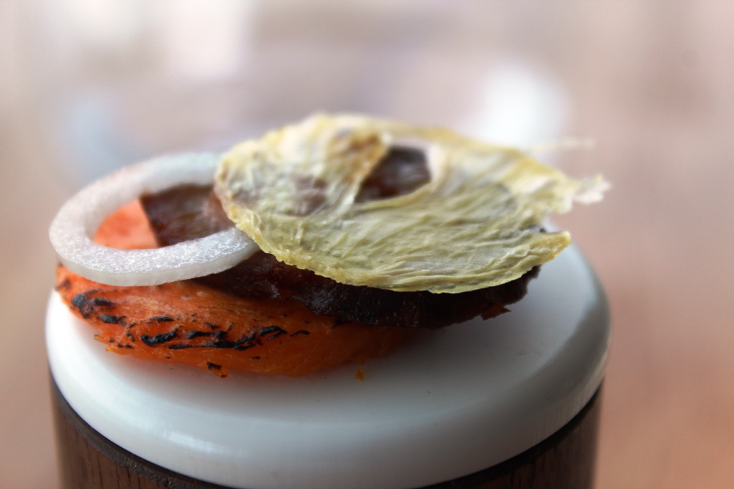 animella di vitello, gel d’ibisco, cipolla bruciata e tartufo bianco