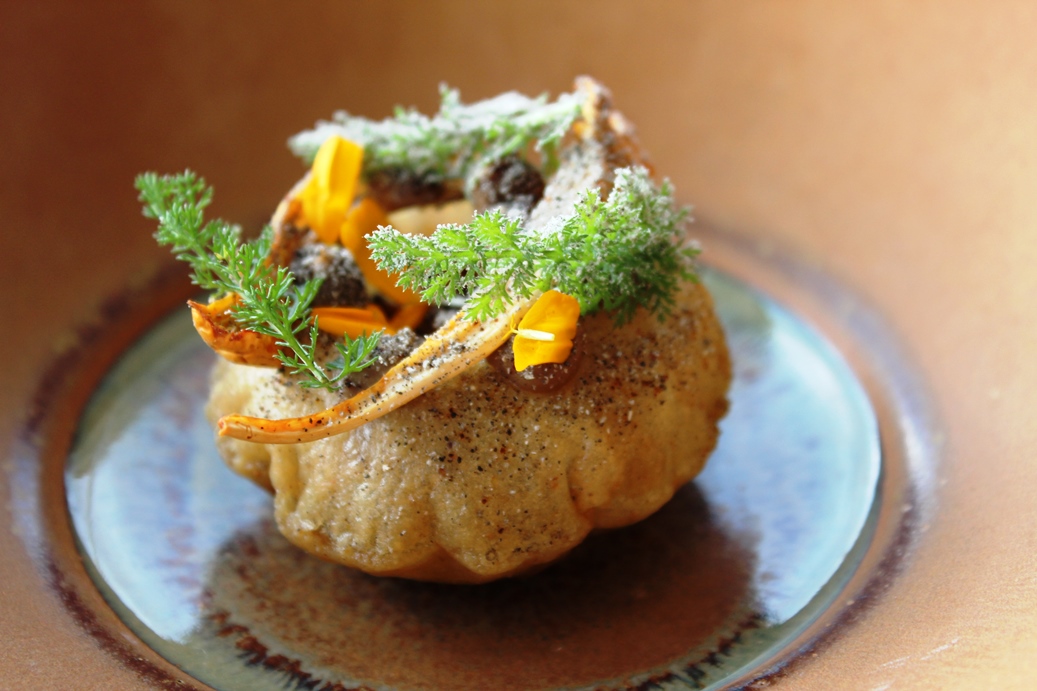 Arrivano i piatti principali, il rombo, pepe di chihuacle, salsa di aglio nero e agrumi, purè di topinambur, l’animella di vitello, gel d’ibisco, cipolla bruciata e tartufo bianco e l’anatra, mole della città d’Actopan, semi di senape e cavolo brasato. Tutti i cuochi a tutti a tutte le latitudini e le longitudini, si giudicano per il “dominio del fuoco”, per le cotture, tutte millimetriche, in questo caso, a dimostrazione di una grande sensibilità nell’abbinamento e rispetto verso la materia prima.