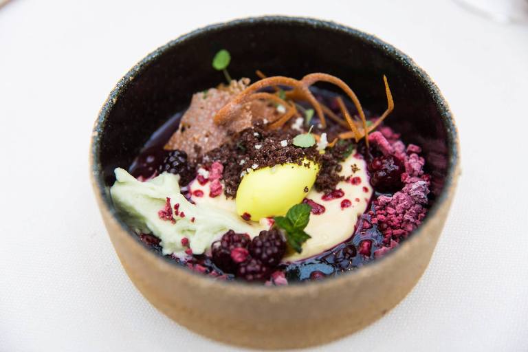 Coda di rospo, lomo “Joselito”, mirtilli, succo di cavolo fermentato