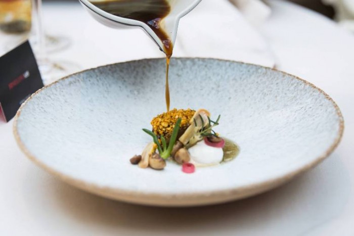Ravioli di formaggio Epoisses, succo di patata, reni di coniglio, chorizo “Joselito”