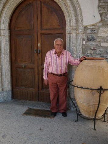 Mi spiega che la sua vigna affonda le radici su un letto ricchissimo di argilla e calcare, tipicamente cilentani. E’ esposta a mezzogiorno in collina, dove si può toccare con mano il mare turchino. E’ collocata a 400 metri s.l.m., nel comune viciniore di San Mauro Cilento, ove insiste anche la cantina e l’allevamento è a cordone speronato. La produzione vinicola, curata dall’enologo avellinese Di Meo, interessa appena tre etichette sotto la denominazione Paestum Igt: il Fiano Cerzalonga, la Barbera e, soprattutto, il Kanthari Aglianico.