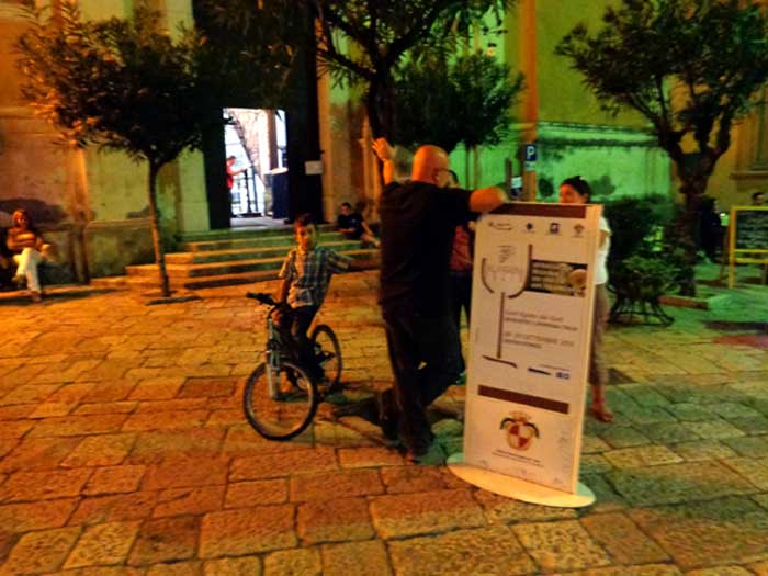 Supero una chiesa, è ancora aperta, arrivo a Piazza Municipio incrocio via Perna, svoltato l’angolo, in un attimo giungo alla meta, un cartello con sfondo marrone e bordi bianchi, di quelli utilizzati per la segnalazione delle emergenze storiche, indica la scritta “Palazzo S. Francesco (sec. XIII-XVIII); l’ultima asticella del secondo numero romano è quasi cancellata e mi fa sorridere il pensiero che qualche studioso locale l’abbia potuta cancellare di notte perché ha scoperto che qualche centinaio di anni sono un errore di classificazione del Monumento insopportabile; l’antica opera architettonica è composta da chiesa e convento, già caserma nel 1865, ancora edificio ecclesiastico nella seconda metà del ‘900 ed oggi di proprietà del Comune che vi organizza eventi musicali e culturali.