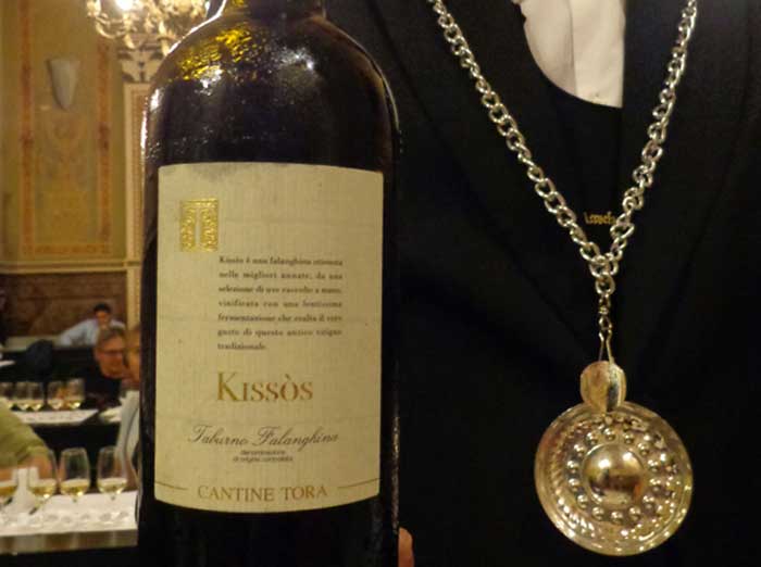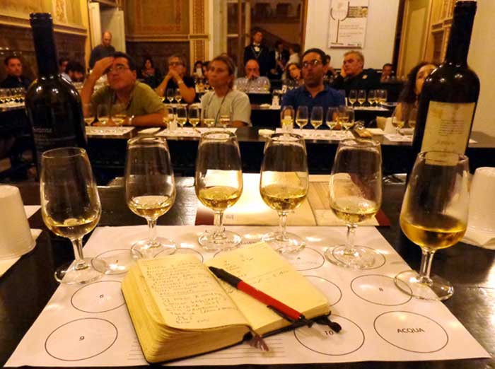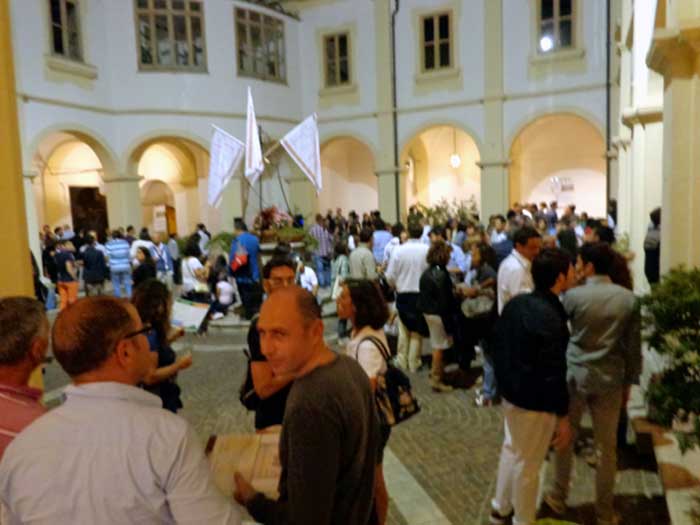 Si respira una bella aria, i banchi di degustazione sono posizionati tra le campate delle parti laterali coperte del cortile interno, i Sommelier AIS di tutta la Campania, con grazia e gentilezza, versano il dorato nettare di dioniso nei calici ai convenuti spiegandone, a richiesta, le caratteristiche organolettiche; ho un poco di tempo prima che cominci il mio “racconto enoico” e decido di dare un’occhiata, salutare i miei amici e soprattutto degustare in anteprima il vino che, di li a poco, avrei dovuto narrare e che trovo in splendida forma.