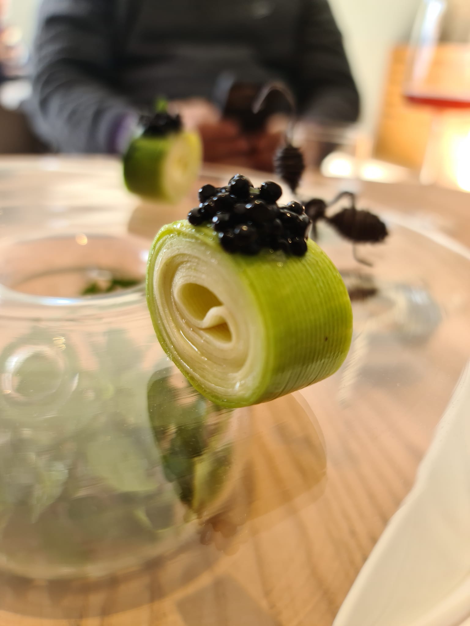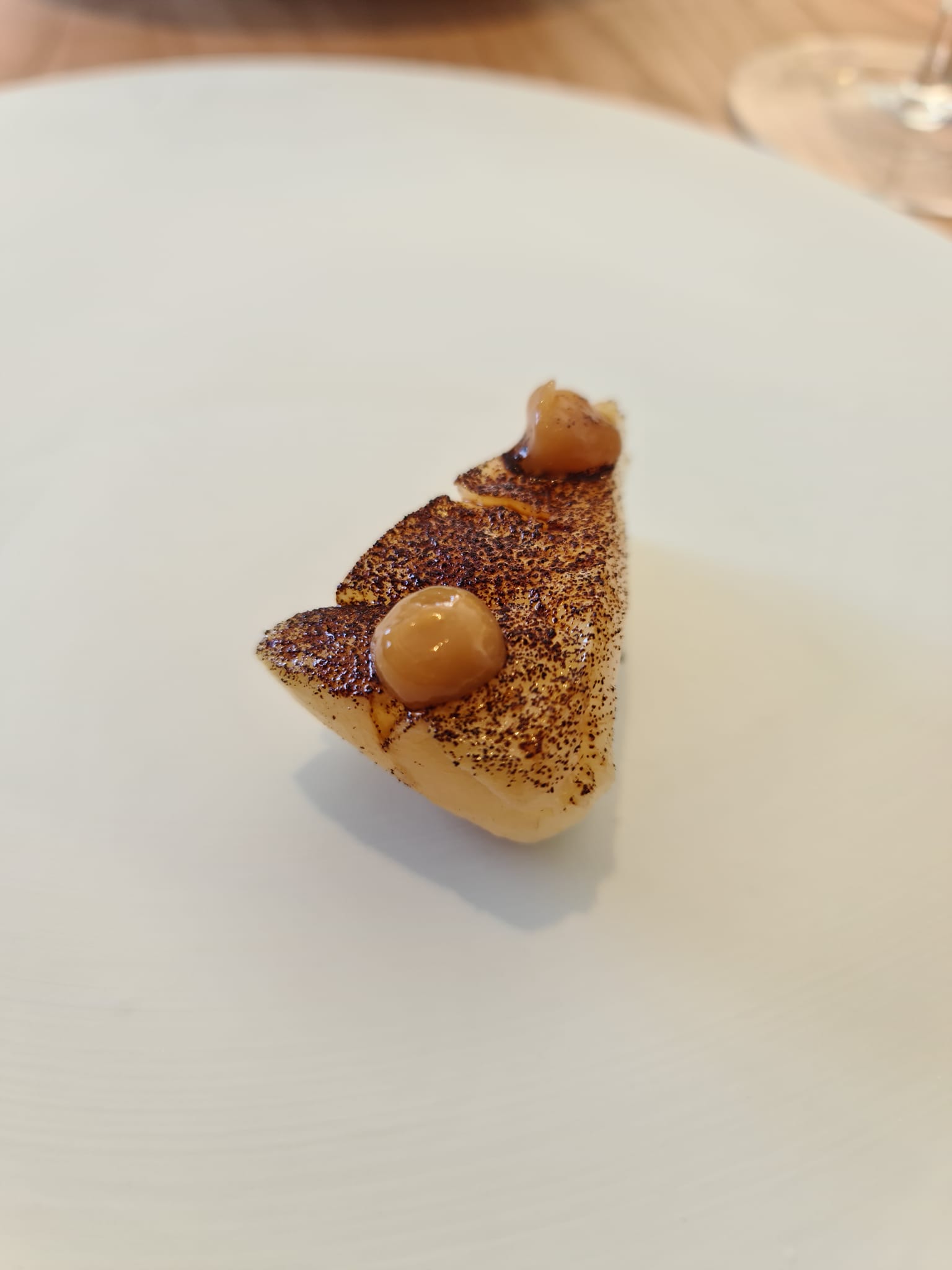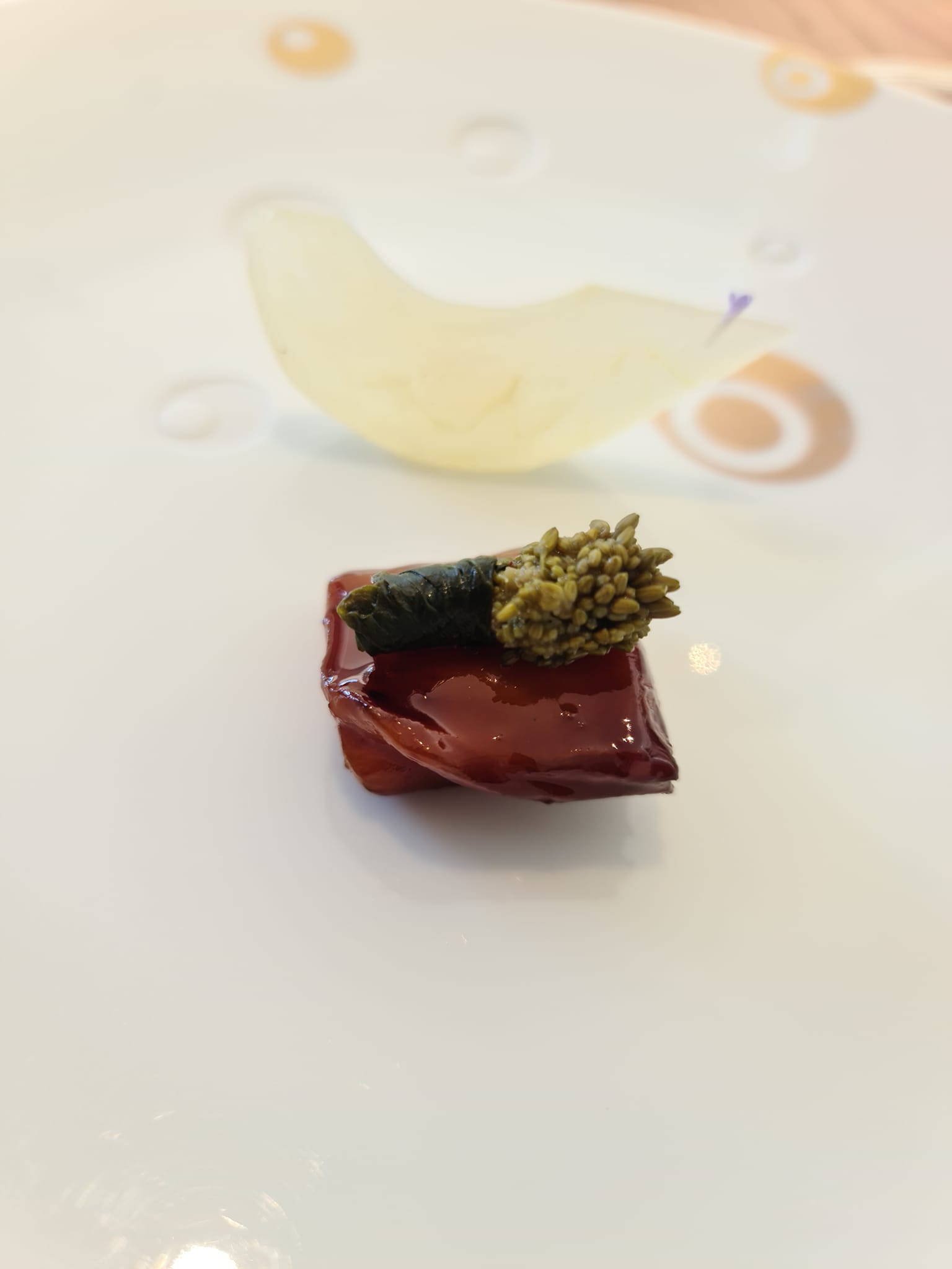 Il cantalupo e lo sgombro sono una versione molto personale del sushi, con un lavoro notevole sul cantalupo che viene osmotizzato con due differenti acidi di riso, un boccone sontuoso. Il tagliolino di zucchine, tartufo nero e menta è uno degli snack storici, ma non è lo stesso delle precedenti cene. La consistenza è cambiata, il morso è diventato più pieno, rotondo e godibile. L’assaggio che più mi ha colpito è senza dubbio la melanzana, miso e lamponi. Una versione contemporanee della parmigiana di melanzane. Se nella tradizione il tutto è giocato sulla golosità, nella versione di Giuseppe eleganza e freschezza ne prendono il posto. Davvero Notevole.