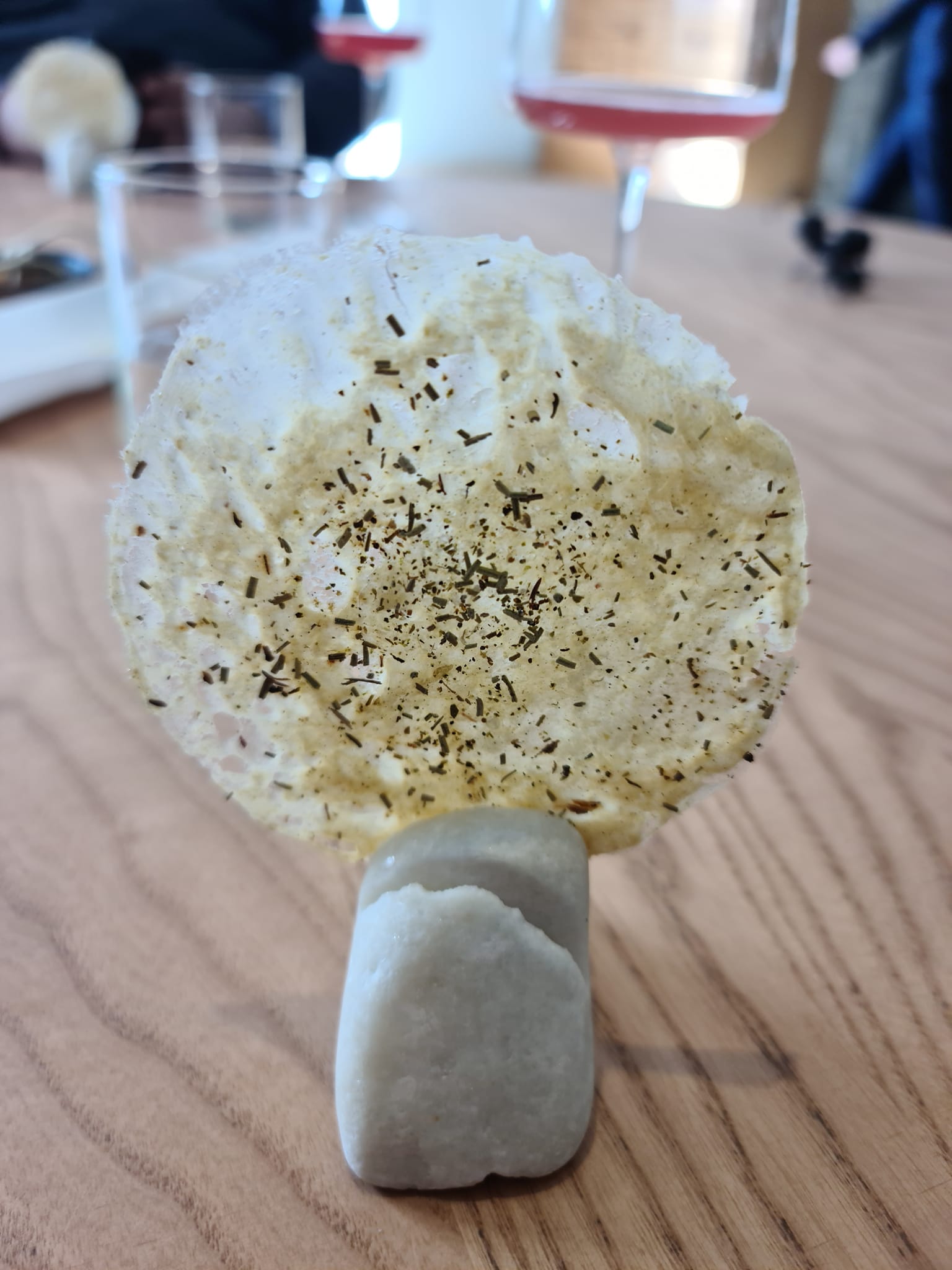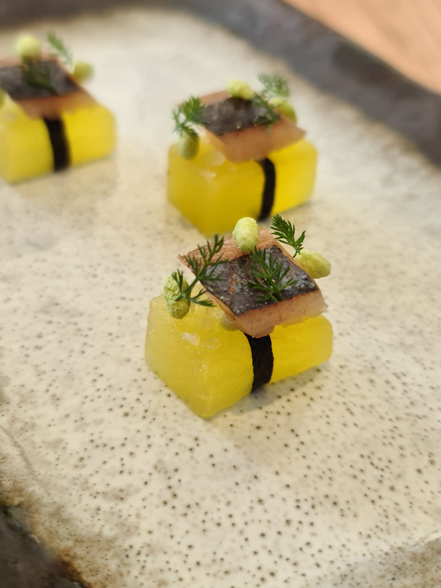 Una parte iniziale, quelli degli snack, da mangiare con le mani, una parte centrale, in crescendo nei sapori, una parte finale riservata ai dolci. Niente è lasciato al caso, c’è della musicalità in questa sequenza. Si parte con la fermentazione. Il daikon è croccante, fresco, induce tanta salivazione. Poi il pollo e patate. Una chips di riso che prende il sapore del pollo, attraverso la pelle e le patate croccantissime all’interno ripene di una spuma di patate, soffice ed eterea.
