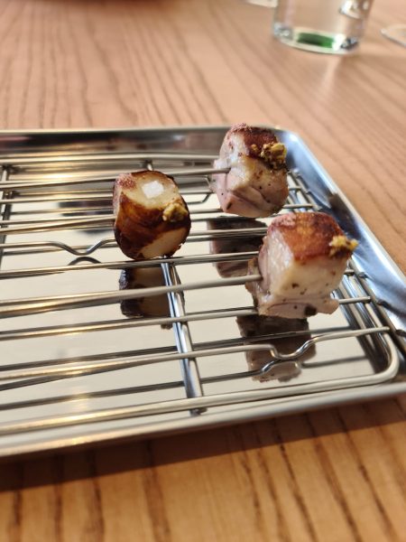 Una parte iniziale, quelli degli snack, da mangiare con le mani, una parte centrale, in crescendo nei sapori, una parte finale riservata ai dolci. Niente è lasciato al caso, c’è della musicalità in questa sequenza. Si parte con la fermentazione. Il daikon è croccante, fresco, induce tanta salivazione. Poi il pollo e patate. Una chips di riso che prende il sapore del pollo, attraverso la pelle e le patate croccantissime all’interno ripene di una spuma di patate, soffice ed eterea.