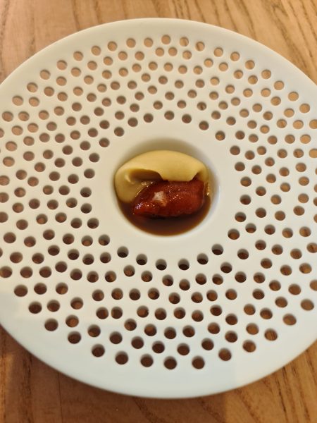 L’agnello e shitake è il piatto del viaggio. La parte grassa dell’agnello è croccante, la carne è quasi cruda, il fondo di accompagnamento è perfetto e da solo fa piatto, le due salsine in abbinamento da centellinare perfette.