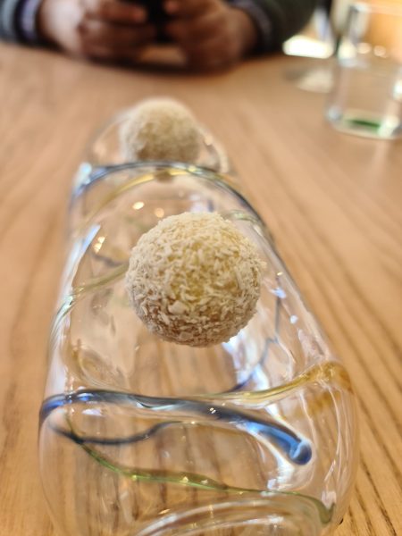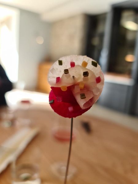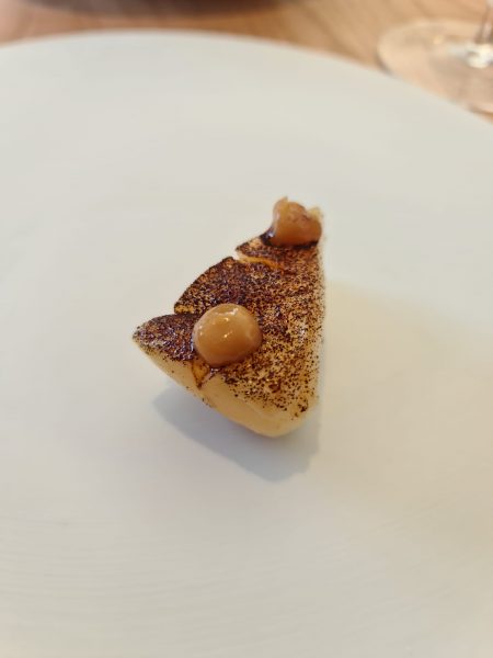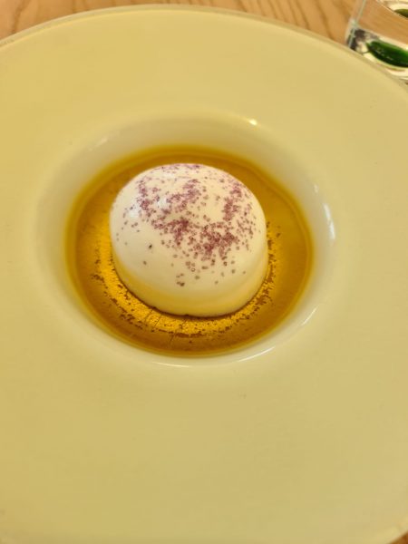 La parte dolce del pranzo, perchè per complessità, varietà ed esecuzione, si tratta di un pranzo dolce vero e proprio. Memoria e gioco, passando per ‘a subretta, la merenda che facevano le nonne con la neve, il mosto cotto e lo zucchero, al complesso e suadente litchis e violette. La piccola pasticceria è ancora in un escorsus nel percorso dell’appassionato di cucina Iannotti, sempre con personalità e timbro personale. Dal classico e buonissomo cannelés bordelais a una mini e perfetta tarte au citron meringuée, fino ad un mochi di cioccolato e allo scoppiettante marshmallow.