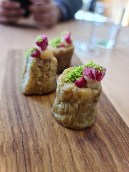 Il cantalupo e lo sgombro sono una versione molto personale del sushi, con un lavoro notevole sul cantalupo che viene osmotizzato con due differenti acidi di riso, un boccone sontuoso. Il tagliolino di zucchine, tartufo nero e menta è uno degli snack storici, ma non è lo stesso delle precedenti cene. La consistenza è cambiata, il morso è diventato più pieno, rotondo e godibile. L’assaggio che più mi ha colpito è senza dubbio la melanzana, miso e lamponi. Una versione contemporanee della parmigiana di melanzane. Se nella tradizione il tutto è giocato sulla golosità, nella versione di Giuseppe eleganza e freschezza ne prendono il posto. Davvero Notevole.