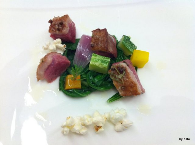 Il guanciale di maiale nero casertano con verdure e frutta di stagione con popcorn. Che dire: è raro assaggiare un piatto freddo tiepido così saporito con questi ingredienti. Per nulla grasso il suino, anzi. E poi l’amaro della verdura, il dolce della pesca. Veramente buono. Ah c’è pure la chip di cotica.