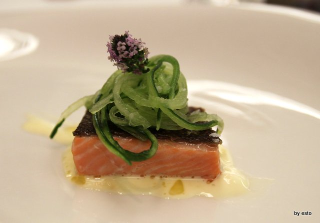 Sfavillante per freschezza la trota con julienne di cetriolo adagiata su emulsione di patate lievemente agliata.