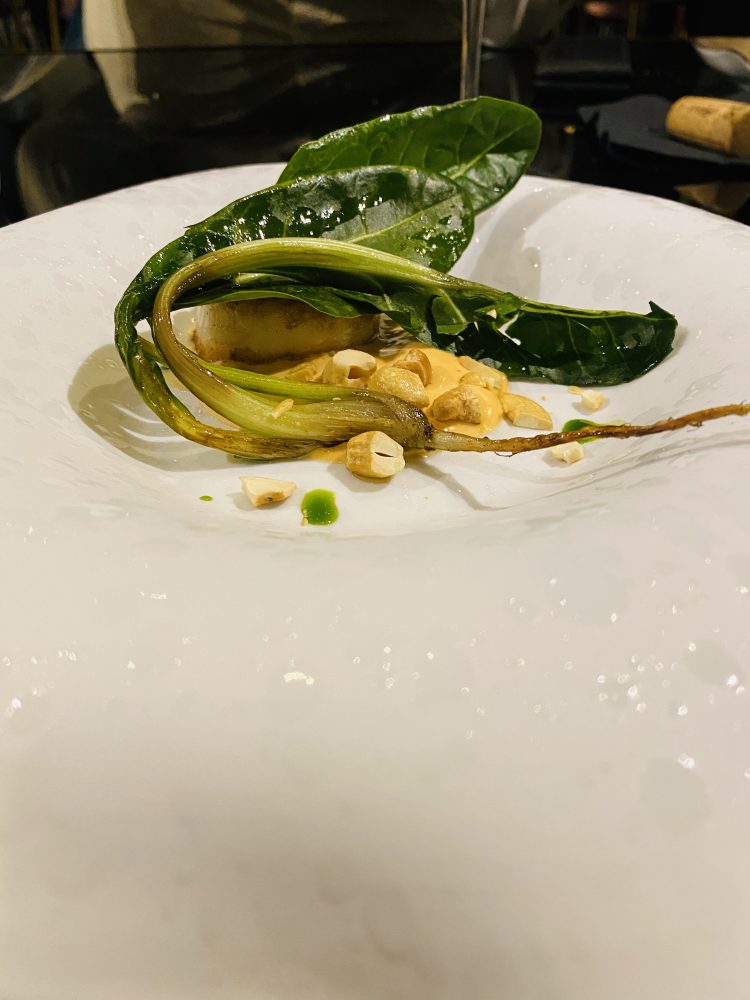 Krianza – Capasanta affumicata, servita con salsa sriracha, animelle e anacardi