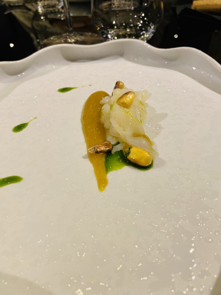 Il menù prevede una degustazione da sette portate a 70,00 euro, due da cinque portate a 40,00 euro, e una contenuta proposta alla carta. Si inizia con la Capasanta con mango, avocado e mais, ideata anche nella versione affumicata, servita con salsa sriracha, animelle e anacardi.