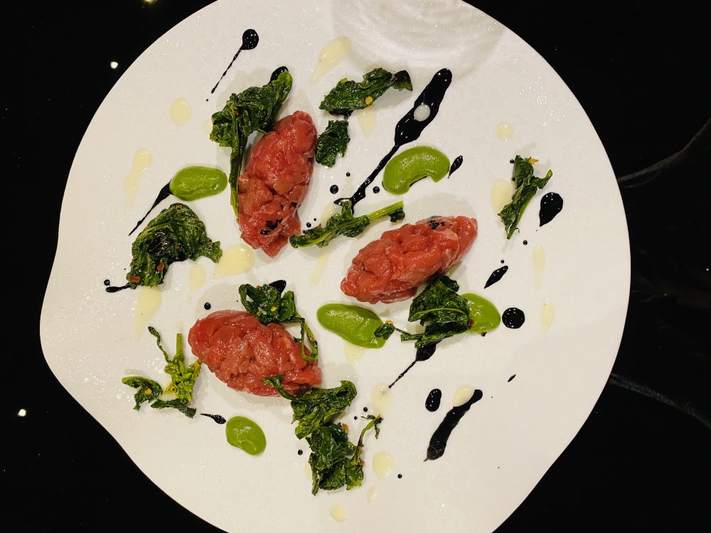 Krianza – Tartare di manzo, cime di rape e provolone del Monaco.