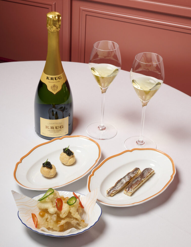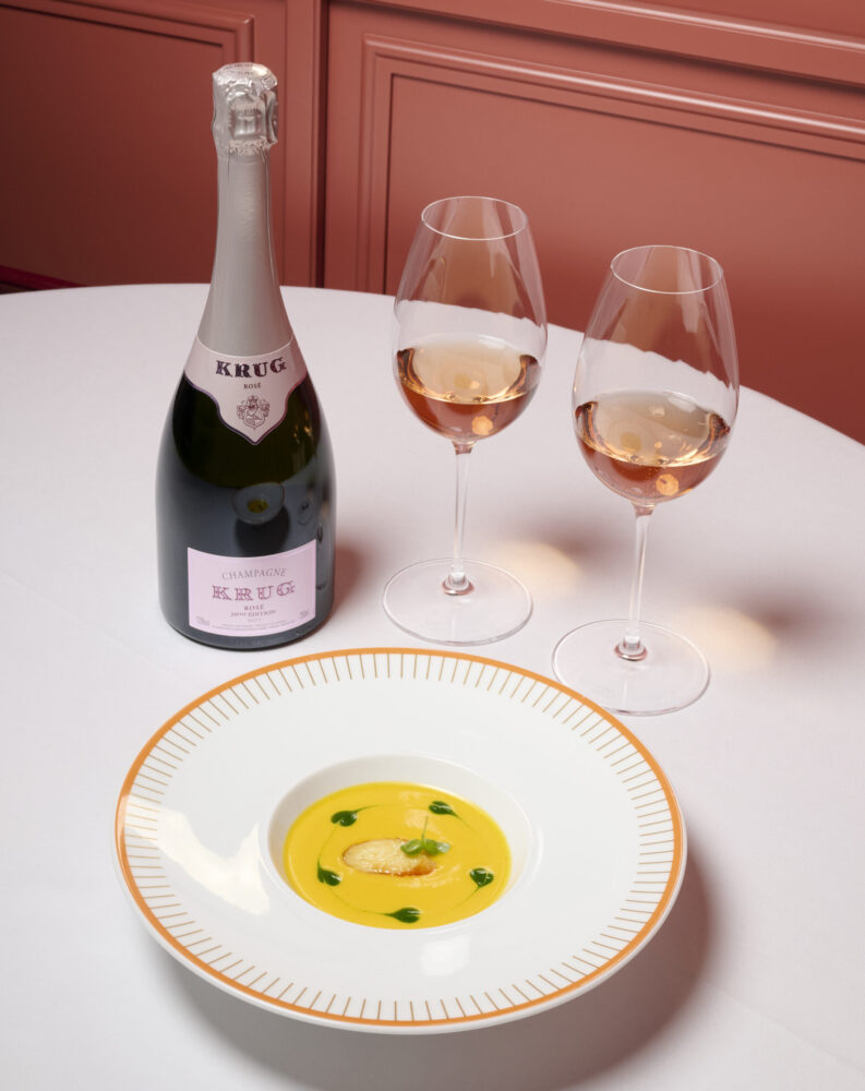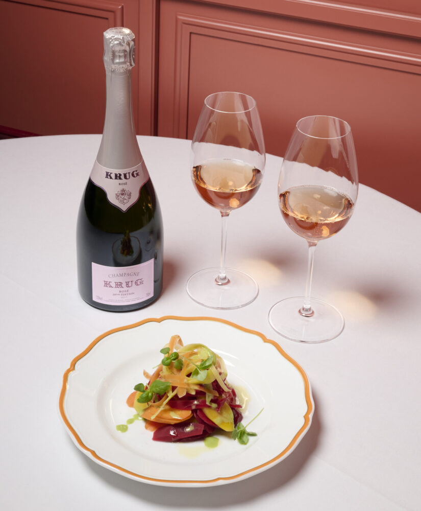 Al Rosè sono stati abbinati ben tre piatti: carpaccio di capesante, ricci e lime; Gazpacho e King Crab e carote di Polignano e salsa jalapeno, omaggio all’ingrediente-totem scelto da Krug nel 2025 (Krug for Carrot) .