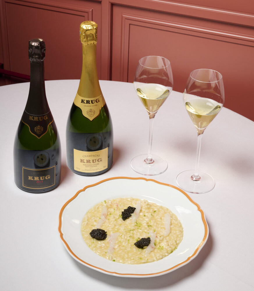 A seguire, Astice Blue Nature accompagnato al Vintage 2011; e “Les Creations de 2013”, Krug 2013 e Krug Grande Cuvèe 169èeme Edition presentate con il risotto scampi, caviale e lime.