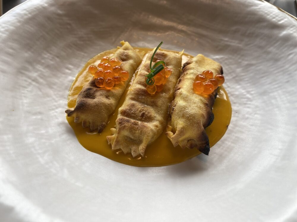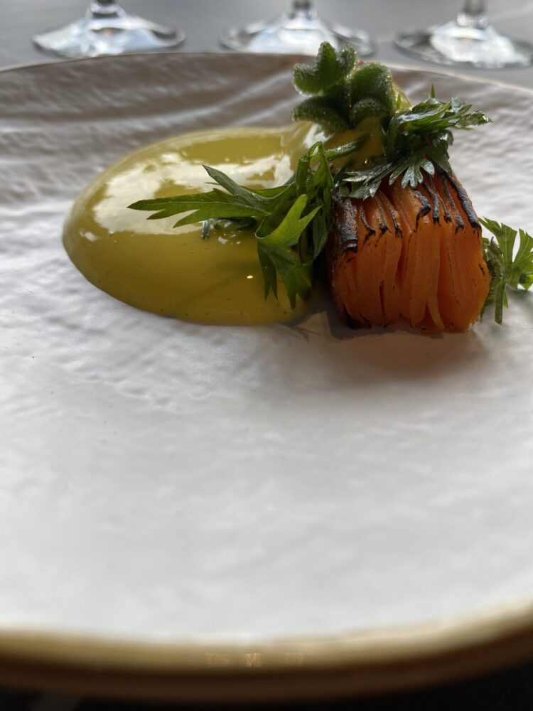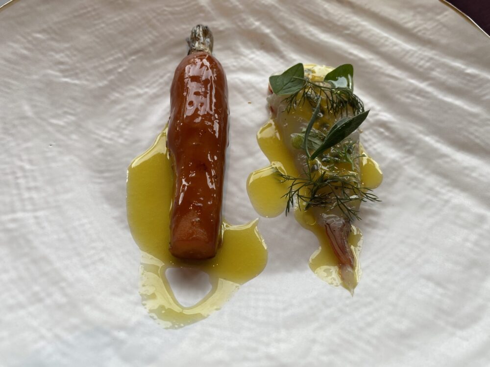 Anche in questa sede Enrico Croatti ha dimostrato di essere a proprio agio tra solidità culinaria e viaggio gastronimico. Carote in salsa bernese; ravioli grigliati di carote, uova di salmone, burro e salvia; mazzancolla alla brace con carote ed erbe di sabbia hanno rivelato il potenziale creativo della carota.