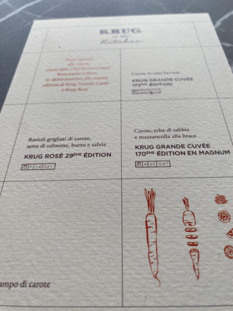 Da oltre un decennio, la maison Krug si è lanciata nella pratica dell’abbinamento gastronomico, oltre che dell’intrinseca alchimia enoica. Infatti, dal 2014 promuove un singolo ingrediente che possa stuzzicare la fantasia degli chef da tutto il mondo che appartengono alle Krug Ambassade, per accompagnare la Grande Cuvèe in uscita quell’anno, nonché il Krug Rosè. Ha iniziato con il pomodoro, proseguendo con l’uovo, la cipolla, il limone, il riso, il pepe, i fiori. Quest’anno il progetto Krug in the Kitchen incorona la carota a ingrediente principe. E, ovviamente, la curiosità si scatena, perché è un ingrediente che non diresti mai.