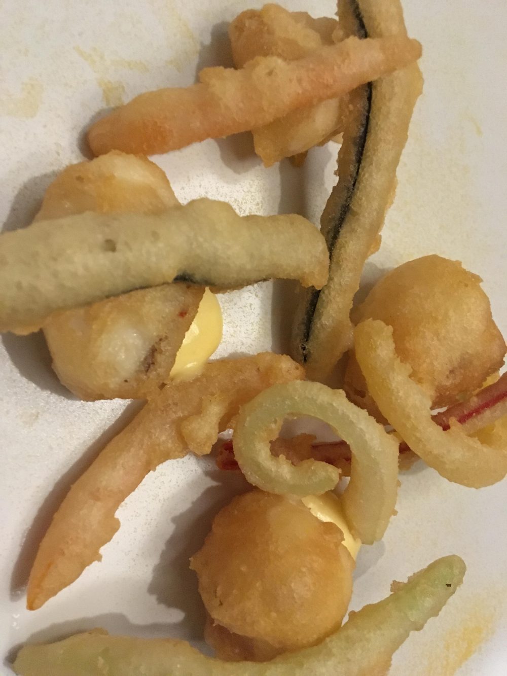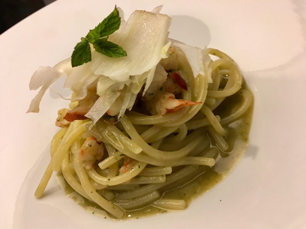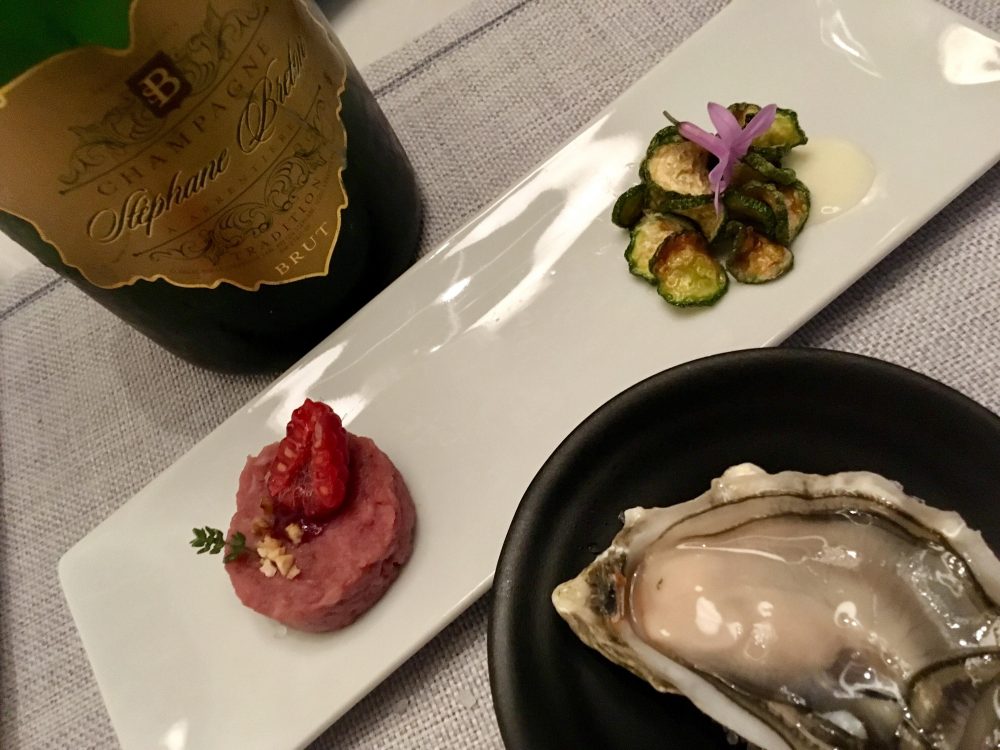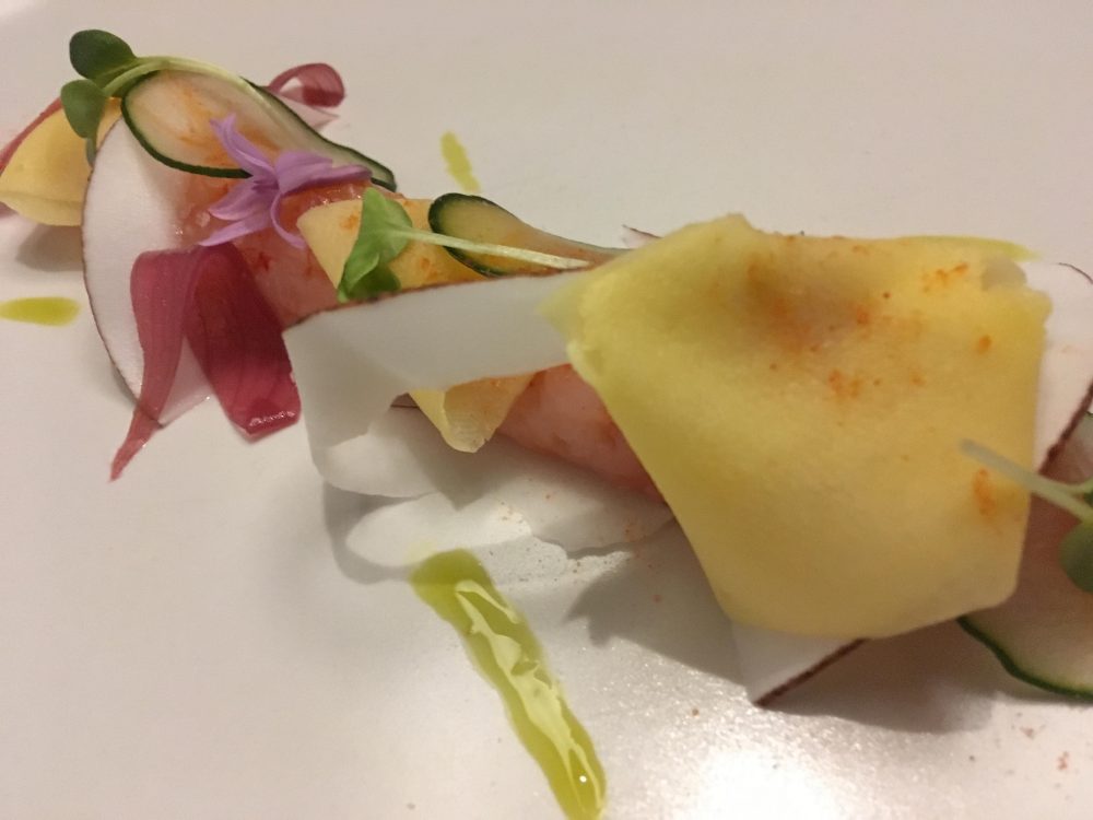 L’uso della materia prima vegetale di produzione propria è indovino, manca una nota erbacea e speziata in più a sorreggere l’insieme. Filetto di Bufala con Zucchine alla Scapece e Variazione di Agnello con il suo Prosciutto. Sapori forti, ben decisi, robusti. Cottura millimetrica. Avrebbero forse beneficiato come già detto di un intervento erbaceo pur rimanendo piatti goduriosi. Sovvertendo per l’ennesima volta l’ordine di degustazione di passa agli antipasti. Ben precisi, grande sfoggio di tecnica e pensiero da parte dello chef. La sequenza di Ostrica, crudo di Manzo & Zucchino San Pasquale alla Scapece preparano il palato alla degustazione di cui ho già parlato, toccandone vari aspetti. Rotondità, acidità, sapidità. Ottimamente eseguita la Tempura, così come il crudo di Gambero Rosso.