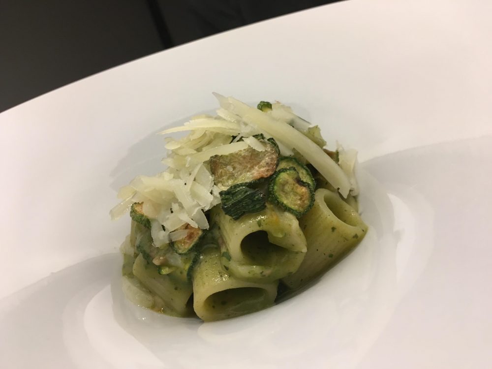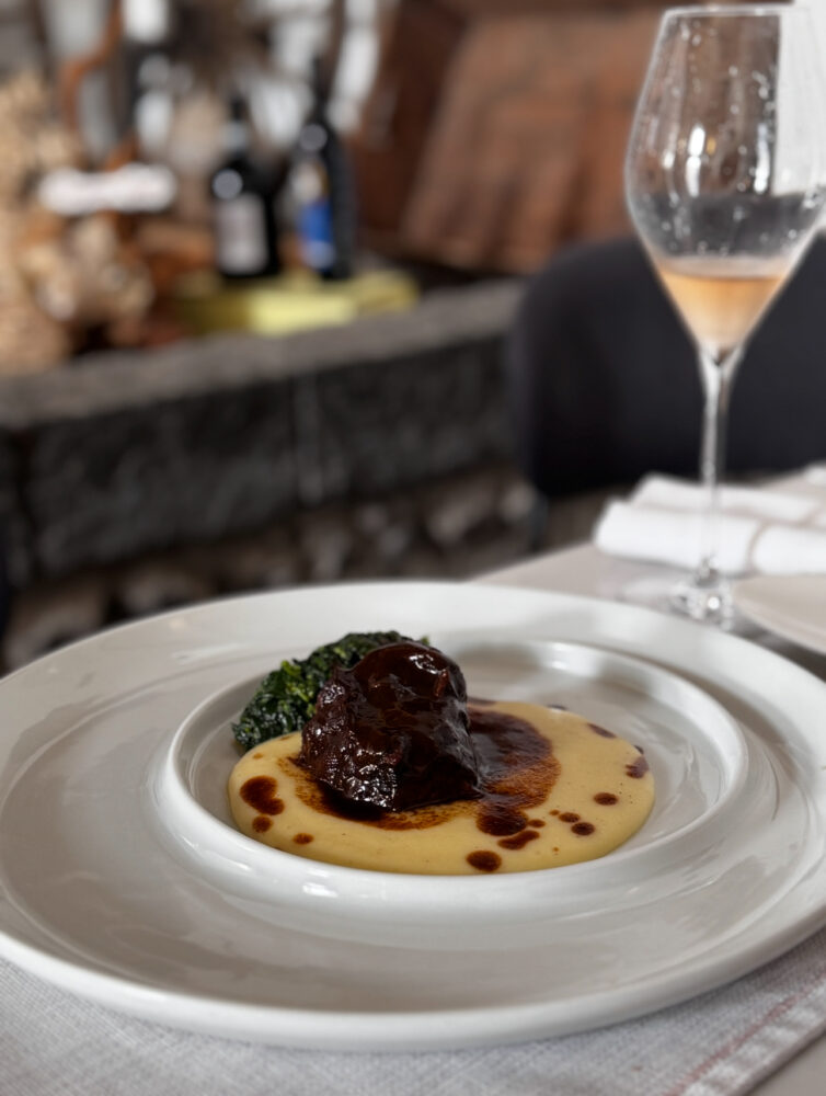 Salutando l’estate che fu, ma che in alcuni giorni resiste all’autunno, si inizia con il fiore di zucca avvolto da pasta kataifi, farcito alla Nerano, abbracciato da un profumato ragù di cinta senese e completato da croccanti chips di zucchine: un dialogo tra orto e tradizione che conquista al primo sguardo.