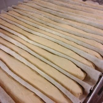 Autolisi (processo biologico) gira per 6 minuti a velocità 1. Riposa da un minimo di 30 minuti a 10 ore; ma dipende dalla stagione: in estate minimo 30 minuti; in inverno 10 ore. Impasto gira 10 minuti alla velocità 1. Riposa per 20 minuti in macchina, poi fa un giro alla velocità 1. Riposa altri 20 minuti, poi fa un giro alla velocità 1. Riposa altri 20 minuti, poi fa un giro alla velocità 1. In totale riposa 1 ora e ogni 20 minuti fa un giro alla velocità 1: in totale quindi 3 giri alla velocità 1. Mastelli da 8 kg. Rimangono in frigo coperti per un giorno. Toglierli dal frigo e portarli alla temperatura ambiente, spezzatrice e riposo per 30 minuti, filonatrice. Le baguette riposano altri 20 minuti. Incidere le baguette con il famoso taglio del rasoio (con una lametta). La cottura a 260° costante, valvole chiuse, vapore, poi start per circa 19 minuti.