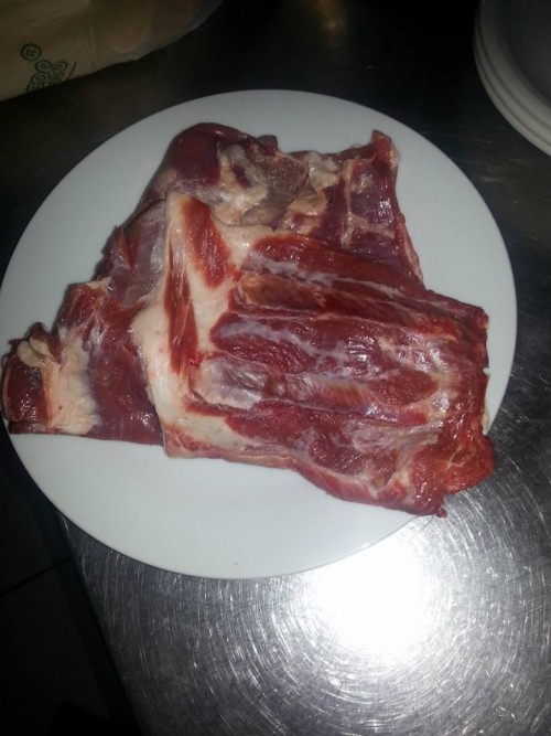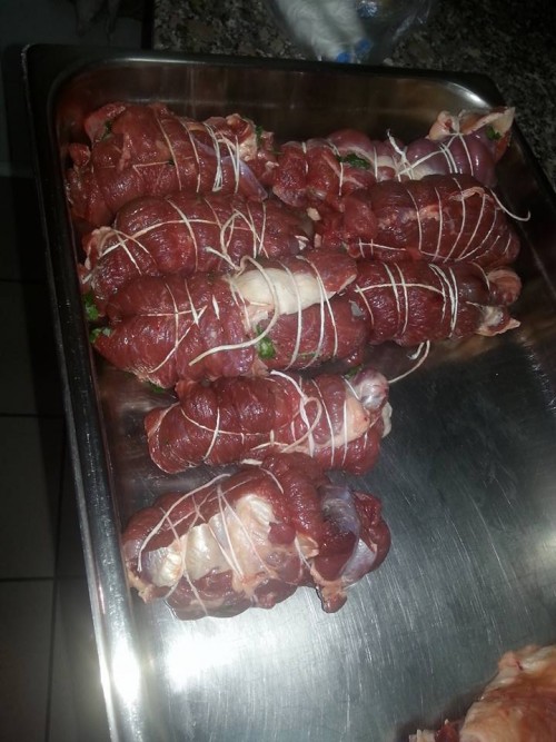 Ottima è la spalla ma anche la coscia e la pancia, quest’ultima più ricca di nervi. Assicura, però, Gerardo Figliolia che facendo “pippiare” (cuocere) la carne a lungo questa diventa morbida. Le chef la tagliano a punta di coltello, la puliscono accuratamente e la privano delle ossa e formano dei pezzi idonei per preparare gli involtini che vengono farciti con prezzemolo finemente tritato, formaggio pecorino romano grattugiato, aglio, pepe nero e sale. Legano il tutto con un filo di spago da cucina ben stretto e passano a soffriggerle in un tegame di creta con olio extra vergine d’oliva, cipolla tagliata, aglio a spicchi schiacciato. Dopo che il tutto, ben coperto, ha rosolato versano un bicchiere di vino rosso ben strutturato ed una volta che questo evapora aggiungono il passato di pomodoro di San Marzano, i pelati opportunamente tagliati a pezzetti, un altro po’ di sale e pepe.