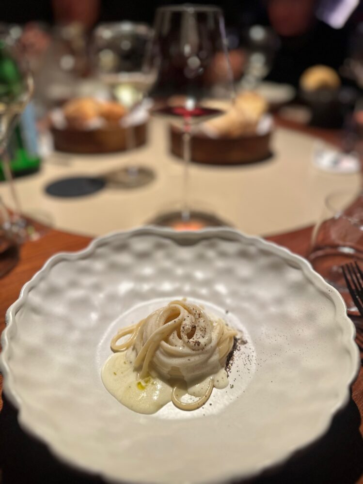 Gli spaghetti Monograno Felicetti scottati sulla brace, trasformati in una cacio e pepe affumicata, rappresentano forse il gesto che più appartiene al suo modo di lavorare, prendere una tradizione riconoscibile e farla passare attraverso una tecnica che modifica il risultato senza snaturarlo.