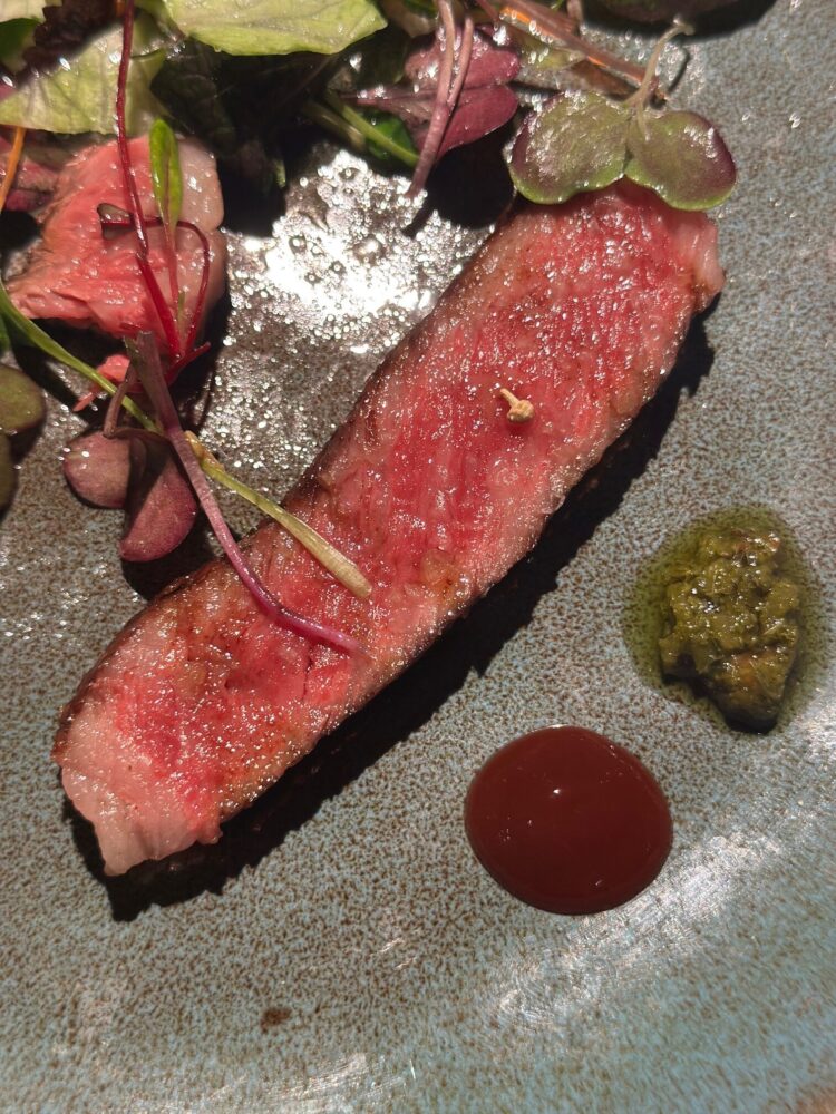 Accanto, la carta propone una selezione ampia di razze e tagli (Rubia Gallega, Swami, Manzetta Prussiana, Angus spagnolo, Umi, Wagyu giapponese e australiano) trattate sempre con lo stesso approccio, dare spazio alla materia senza sovrastarla.