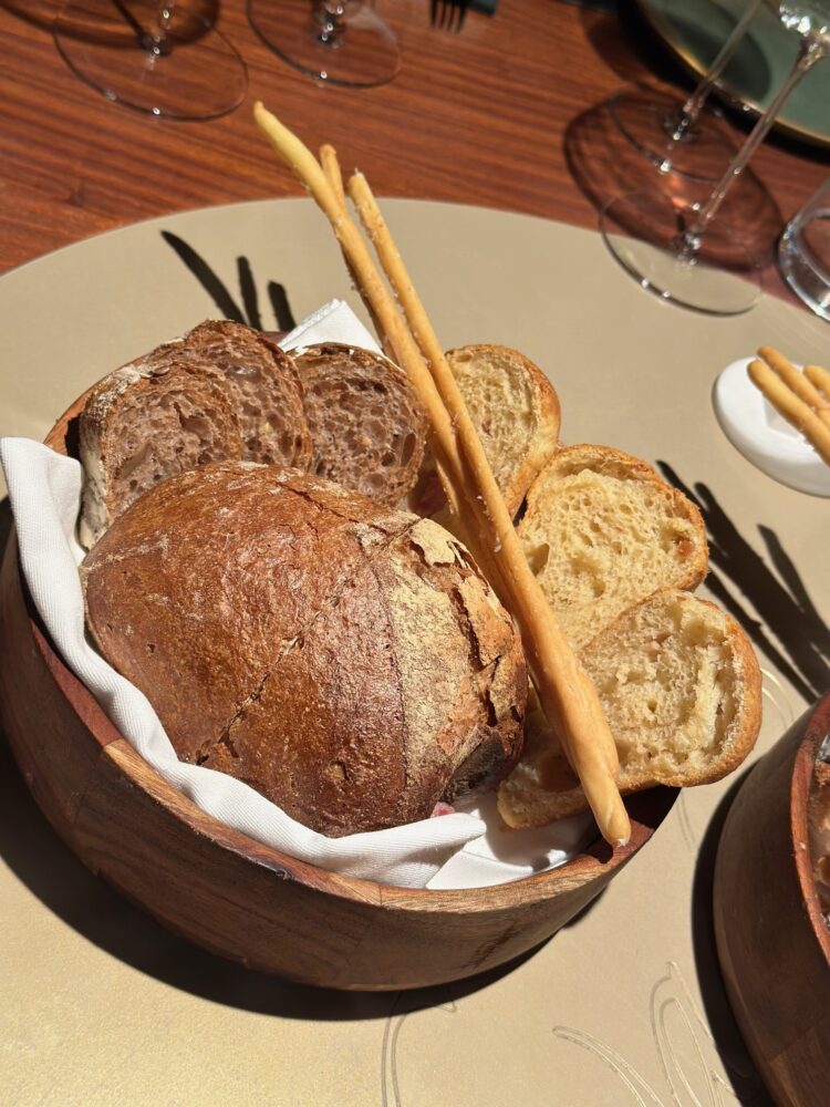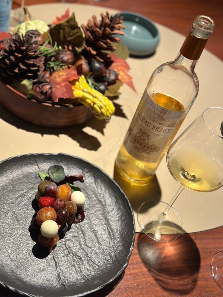 Il finale segue due traiettorie: la transizione in freschezza della panna cotta alle mandorle con granita al limone e finocchio marino, e la complessità di “Suggestioni autunnali” proposta costruita con castagne arrostite, frutta grigliata, una riduzione di Aglianico e una crema al Blu ’61, erborinato affinato in passito, un dessert che è sintesi di più anime, dalla freschezza, alla sapidità per arrivare alla dolcezza e a cui si affianca la profondità aromatica del Sauternes Château Filhot 2022.