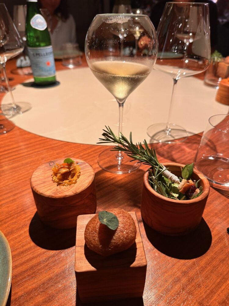 In abbinamento il Franciacorta Camilucci Ammonites, che accompagna gli amuse-bouche con una freschezza nitida e una bollicina sottile, perfetta per pulire senza sovrastare.