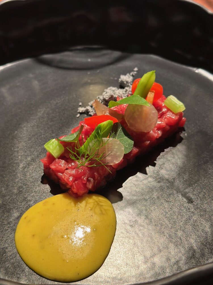 La picanha di Creekstone, un taglio raramente destinato al crudo, diventa tartare grazie a una lunga maturazione controllata, che ne ammorbidisce la fibra senza intaccarne l’identità.