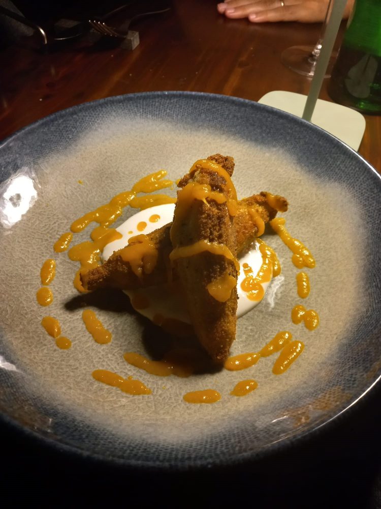 Cavallo di battaglia, però, per iniziare è “il ciurillo”, dice Dante, ovvero fiore di zucca ripieno con mousse di ricotta e maiale su crema di pecorino e alici di cetara.