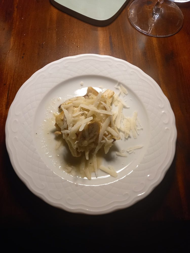 I vini, invece, sono per lo più campani, divisi per zone: Irpinia, Casertano, Salerno e Costiera, Sannio. Le bollicine italiane e gli champagne sono ricercati. Ad accompagnare la nostra cena, infatti, è stato un delicato Franciacorta millesimato 2017, Arcari e Danesi, blend di chardonnay e pinot bianco, dosaggio zero. Come entrèe lo chef Ciro Nicolella ha proposto un crocchè al ragù con mousse di patate al forno, poi funghi porcini crudi con pepe, sale, olio, limone e scaglie di parmigiano.