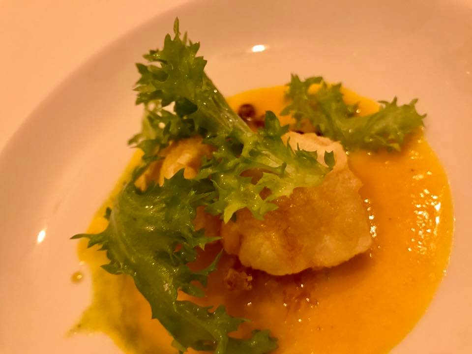 Cantina di Triunfo, Baccala’ indorato e fritto con zuppetta di pomodorino giallo, insalatina di scarole e tapenade di olive nere