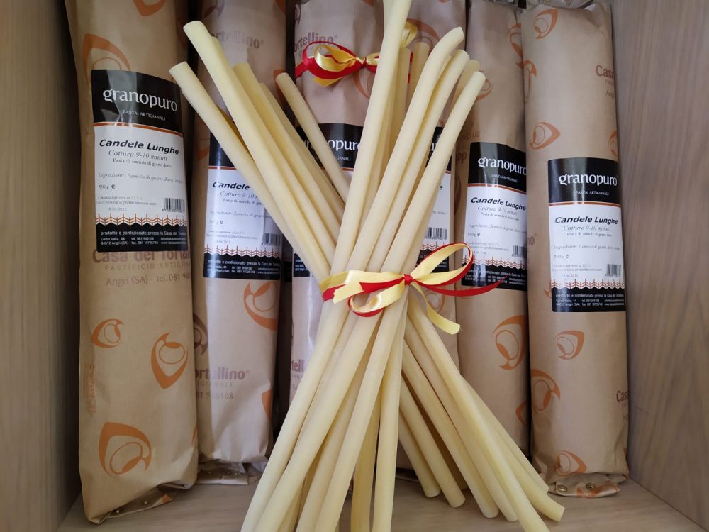 Tra le categorie danneggiate dalle chiusure ci sono sicuramente i piccoli laboratori di pasta fresca e secca che hanno visto drasticamente calare il lavoro, prima a causa del lockdown totale e ora per le chiusure anticipate di ristoranti che loro fornivano. Ad Angri c’è la Casa del tortellino, fondata 30 anni fa dal signor Carmine Orlando e da sua moglie, che oggi è alla seconda generazione, con Gianluca e Giacchino, mentre la terza, già inizia a mettere le manine in pasta. Chi crede di trovare solo un ottimo laboratorio di pasta fresca come ce ne sono tanti, si sbaglia. Qui negli anni, si è andato oltre e gli studi di Gioacchino, dottore in tecnologie alimentari, sono tornati utili: ricerca sui grani italiani e le loro caratteristiche, scelta oculata delle materie prime per le farciture, lunghi tempi di essicazione per la pasta secca. C’è dunque un occhio alla tradizione e un altro alla tecnologia. Qui è possibile trovare la pasta con grano Senatore Cappelli o Carosella, antica cultivar cilentana, che Gioacchino va a prendere nel Cilento più profondo. Le candele sono imbustate come un tempo, nella carta. Saporite anche da sole con un filo di olio buono, si esaltano con gli squisiti pomodori locali, san marzano e corbarino in primis.
