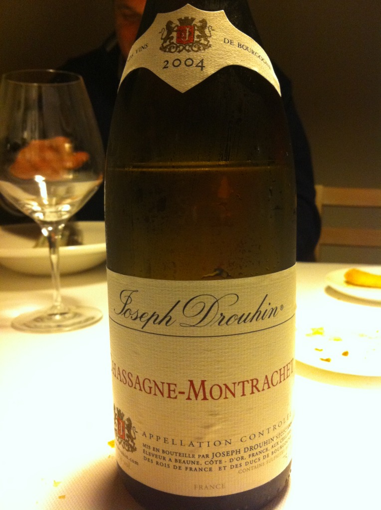 Scegliamo un bianco francese e un rosso italiano – possiamo averli tutti e due al tavolo? Ci piace così. Subito accontentati. Seguiamo così, tra un piatto e l’altro, l’evoluzione nel calice di entrambi i vini. E li beviamo, certo: lo Chassagne-Montrachet 2004 del négociant Joseph Drouhin e il Valtellina Superiore Sassella Rocce Rosse Riserva 1997 di Ar.Pe.Pe.