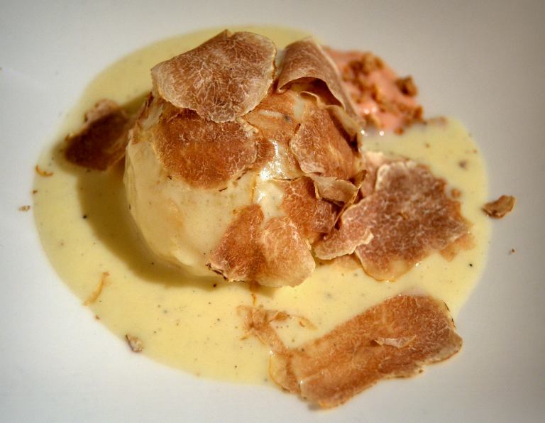 Dulcis in fundo, il “Tartufo… Cioccolato bianco, Mascarpone e Mandarino, accompagnato dalle Grappe di San Leonardo”. Il cucchiaio affonda in una morbida crema avvolta da una sottile sfera di cioccolato bianco, che celebra il tartufo nella forma e soprattutto nel gusto, per questo, capace di preparare il palato ad una grappa elegante ed aromaticamente complessa.