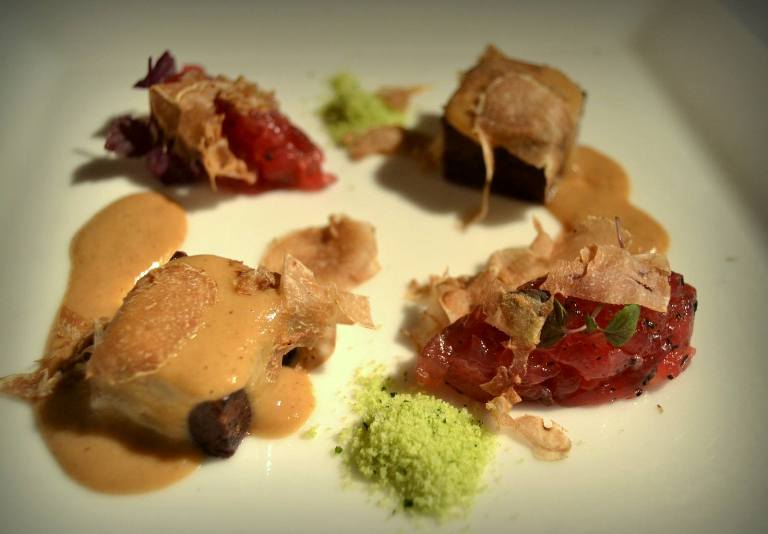 “Ostrica Perle Noire e Balik, accompagnato da Champagne Bauget Jouette Rosè Brut”. Inizia cosi, La Cena in Bianco, con una proposta che punta dritto alla classicità della materia prima, in cui solo per una scelta ben precisa, la totale assenza del tartufo, non si lascia affatto rimpiangere in questo preludio.