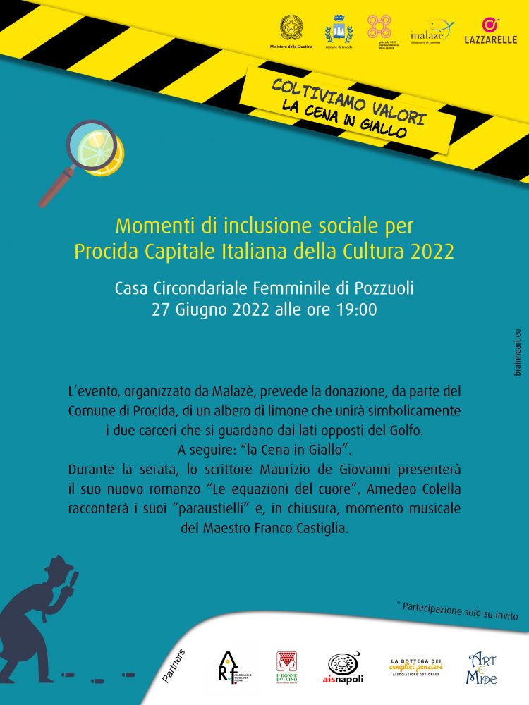 “La Cena in Giallo – Coltiviamo Valori” è il titolo dell’evento che il Carcere femminile di Pozzuoli e l’associazione di promozione sociale Malazè – Laboratorio di Comunità con la collaborazione della Cooperativa Lazzarelle, hanno organizzato per Procida Capitale della Cultura 2022. La manifestazione programmata per lunedì 27 giugno gode del patrocinio del Comune di Procida e di Procida Capitale Italiana della Cultura 2022.