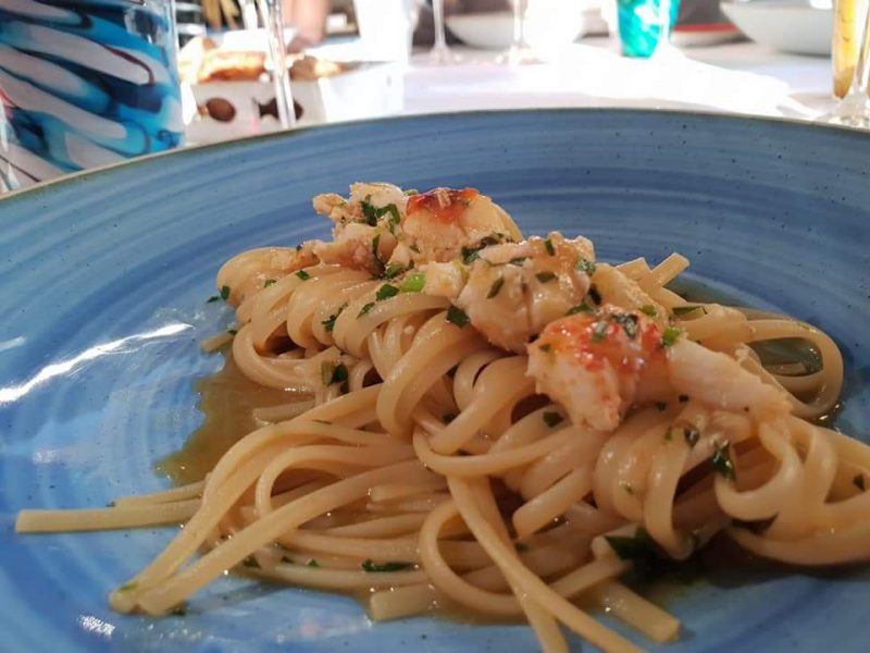 Linguine con aragostine del Cilento – Pescheria. Presa la direzione del pesce continuiamo con un primo piatto, pasta secca, linguine, le mie preferite. Dopo un inizio così raffinato e tecnicamente perfetto sulla pasta non ho dubbi. Voglio un piatto di materia prima unica e ben fatto. Affondo nei ricordi dell’infanzia quando anche nel mare di fronte ad Agropoli se ne pescavano in quantità e non mancavano a casa mia, oggi sono un vero lusso e non facili da trovare, le aragostine del Cilento. Ci riescono i Fratelli Esposito a Salerno. Piccole, succose, dolci, un sapore non comparabile con nessun, seppur ottimo, crostaceo. Qui in un piatto di pasta tirato al dente ad opera dello chef Luigi Iapigio.