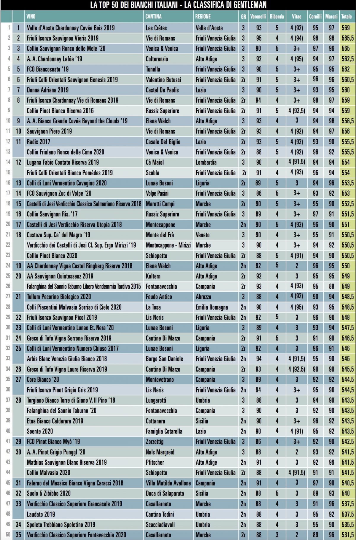 La classifica di Gentleman: i migliori 50 vini bianchi italiani