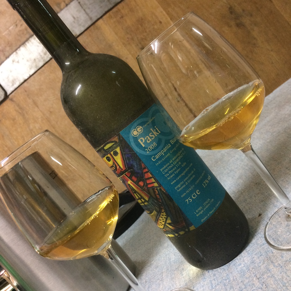 L’esempio tangibile è il Paski da Coda di Volpe bianca 2008, un vitigno che m’interessa sempre più, che conobbi anni fa grazie un piccolo e sconosciuto produttore, oggi conosciutissimo. Antonio mi dice che appartiene alla famiglia dei trebbiani e, infatti riconosco l’impronta olfattiva intensa quasi ovattata dalle note minerali, con erbe amaricanti, come la radice di genziana (tipica in trebbiani di montagna).